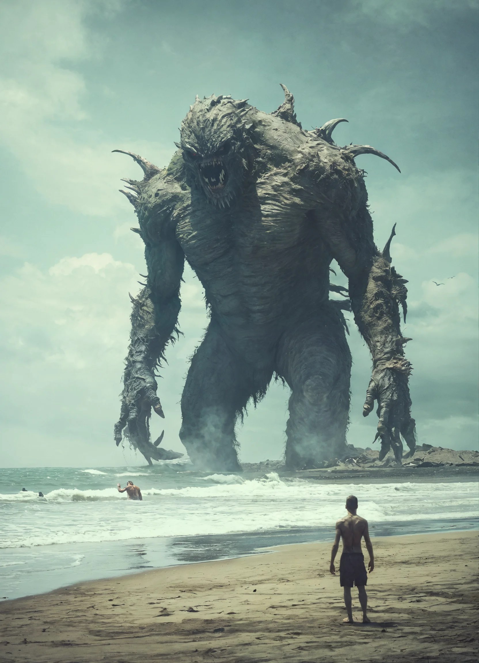 The Tidal Behemoth is a terrifying giant that emerges from the ocean depths, its robust body leaving a trail of destruction as it advances onto the shore. With skin that glistens under the sun, it stands as a towering reminder of nature’s fury.