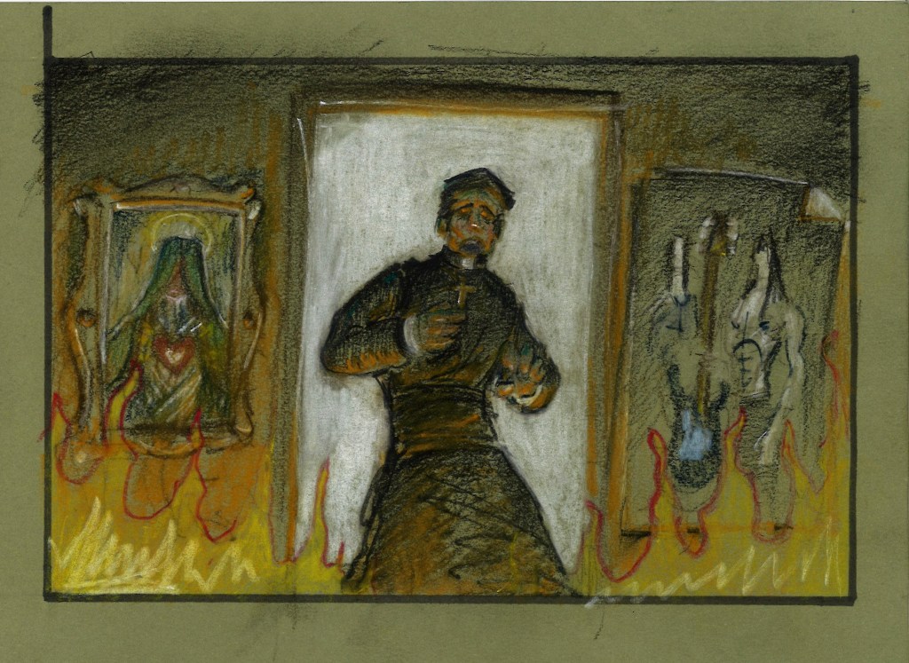 We link exorcism and conservative anti-queerness. Queers are outcast, driven out, made demons. In our story, a priest seeks to exorcise a demon, but is confronted with a gender-bending entity that will not be driven out.